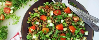 3. Mix the cooled lentils with the spring onions, tomatoes, herbs and 4 tablespoons of oil. Add the lemon juice to taste, season with sea salt and black pepper. Then serve.