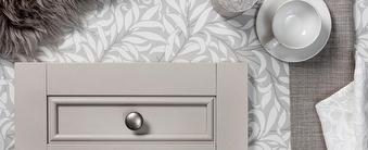 Borastapeter’s unique collection of Linen wallpapers adds a luxurious muted texture to the surface of the wall; the natural palette creates the perfect backdrop to a light bedroom. Borastapeter’s Forest Green Linen has been perfectly matched to the traditional Willesley range with a routed door design in a soft wood grain Odessa Oak finish. This pairing is complemented with Hammonds cool Vienna Bone fabric and a brushed metal handle. Accessorise to bring out the raw natural colours of the oak and the forest green such as faux foliage. This combination encompasses a calm and natural serenity, inspired by traditional furniture and enveloped with a touch of modern class from exquisite materials, creating a relaxing aesthetic.