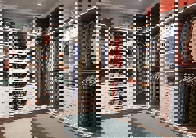 Walk-in wardrobes often lack natural light so brighter tones will make your small room appear more spacious and improve its overall visibility. Plus, neutral colours can evoke feelings of calm and serenity, helping you feel at ease in your new room.