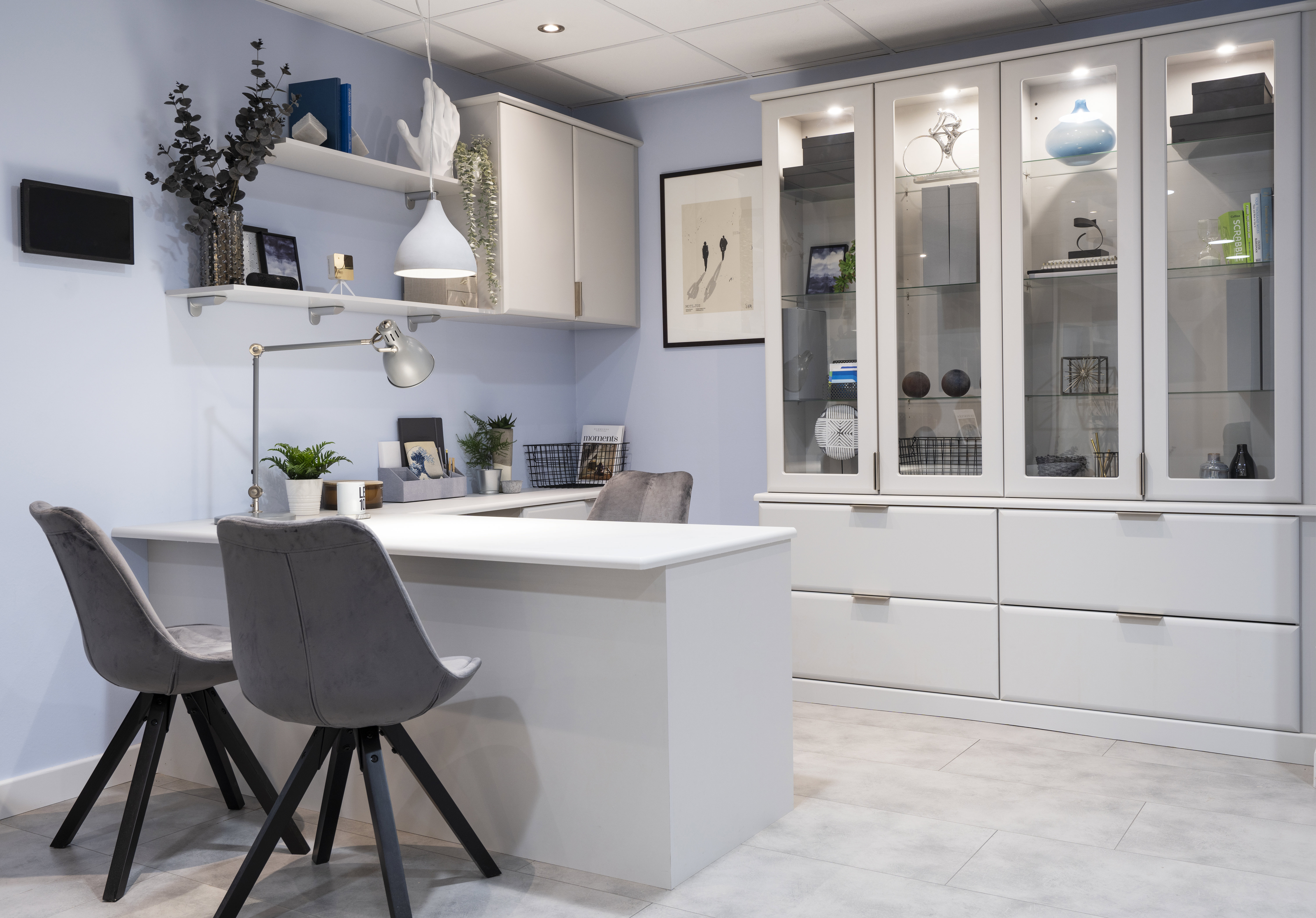 A glass cupboard can help you easily store away important files, keeping everything tidy and clutter-free while also making them easy to locate. Additionally, glass pairs beautifully with integrated LED lighting options, which can be fitted inside cabinets to provide functional, stylish illumination and highlight your display.