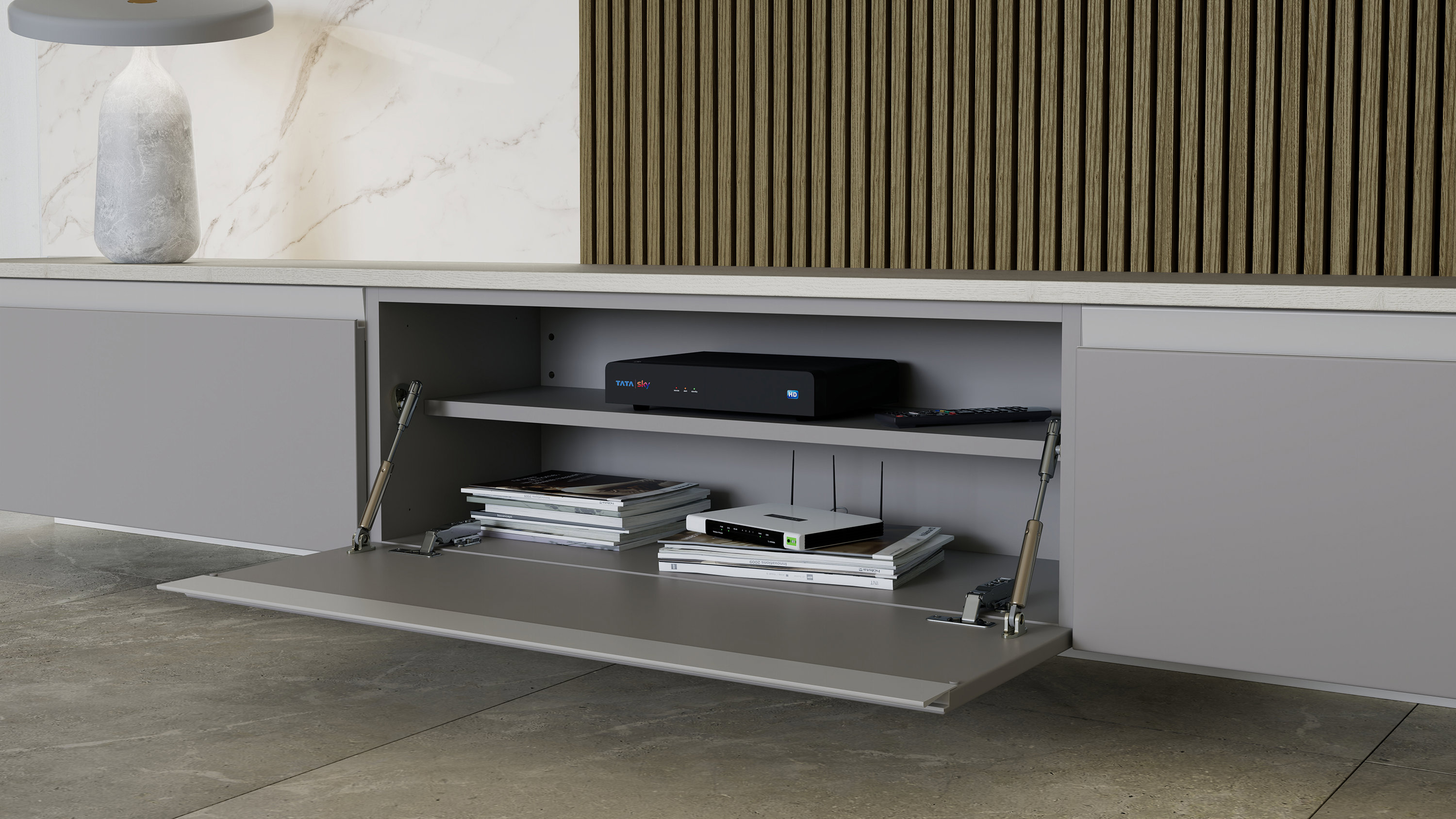 Since every media wall is custom-built, we measure the exact dimensions of your TV, soundbar, consoles and any other equipment. We then design the internal aperture, shelving and compartments to fit those specific items precisely, guaranteeing a flawless fit.