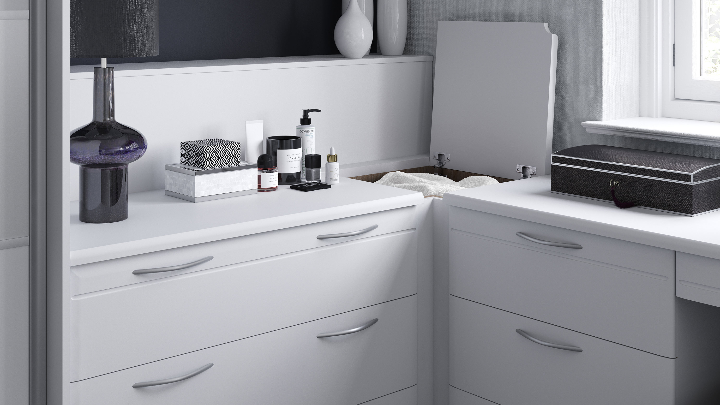 We understand the benefits that storage can have on your life. That’s why our selection of storage options has been expertly designed to offer you a cleverly curated space that works for you. Single or double hanging rails, strong soft-closing drawers and custom-spaced shelves build a brilliant bespoke base for optimum wardrobe storage. The option of pull-out shoe racks, jewellery trays, cosmetic units and a hidden tea tray add a touch of personalisation for your favourite pieces.