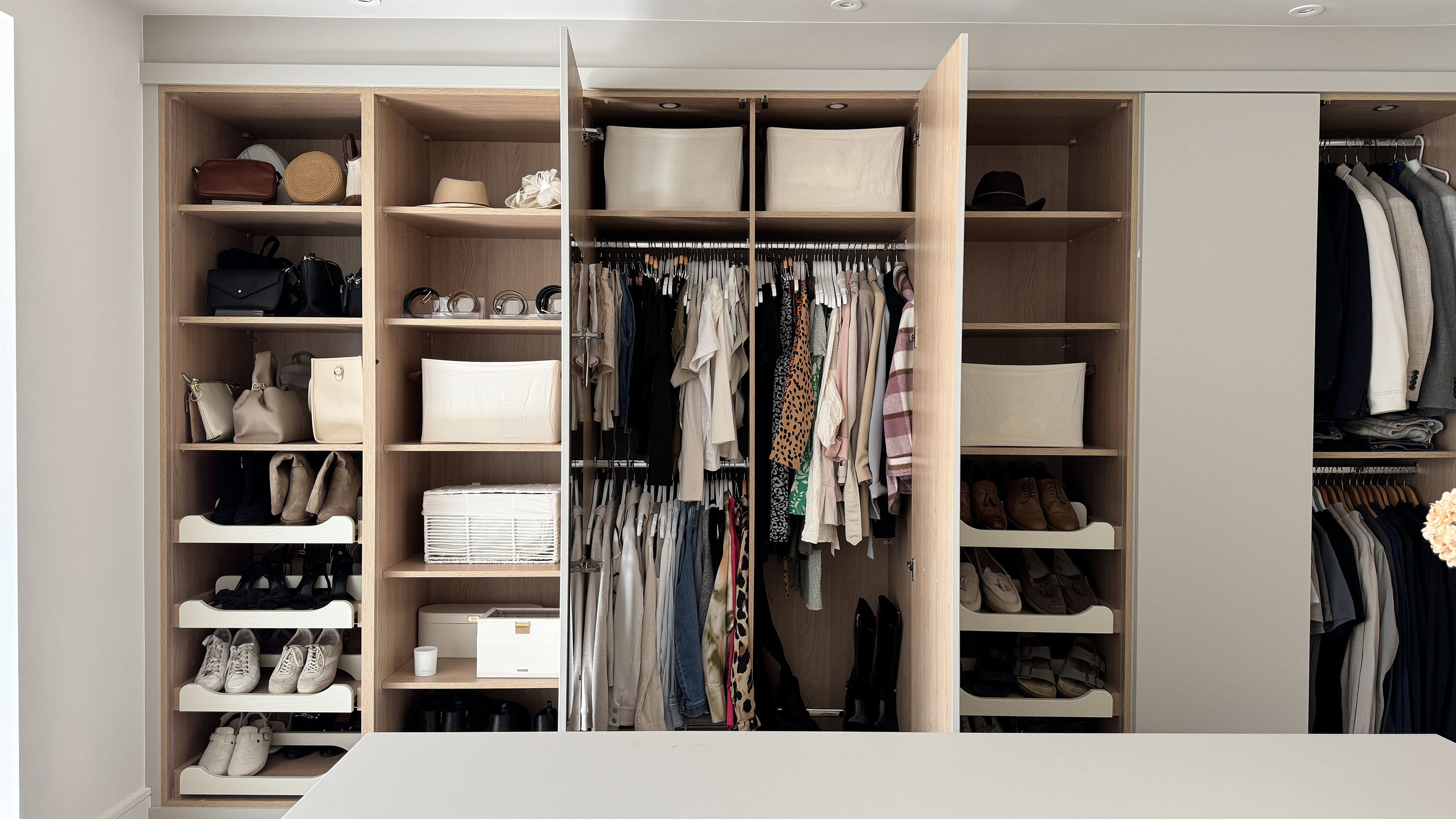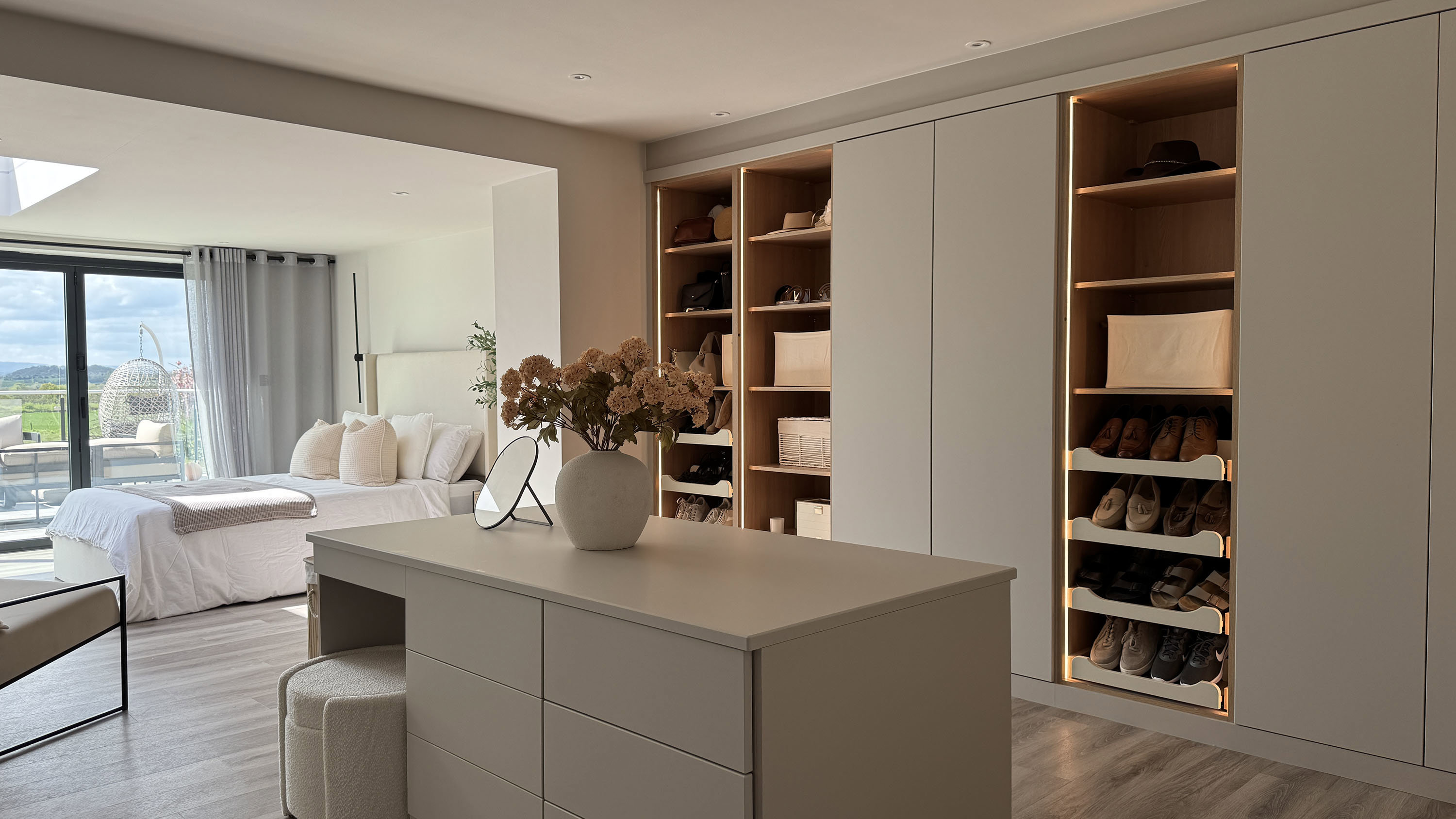 "Having a piece of furniture that is both functional and aesthetic is great. The ease of being able to organise our clothes and accessories and having the space and layout to do so. We love the quality and finish of the furniture and as it's built on site it fits perfectly to the space. We added lights to our wardrobe and mirrors to the inside of the doors which has elevated the space even more. "